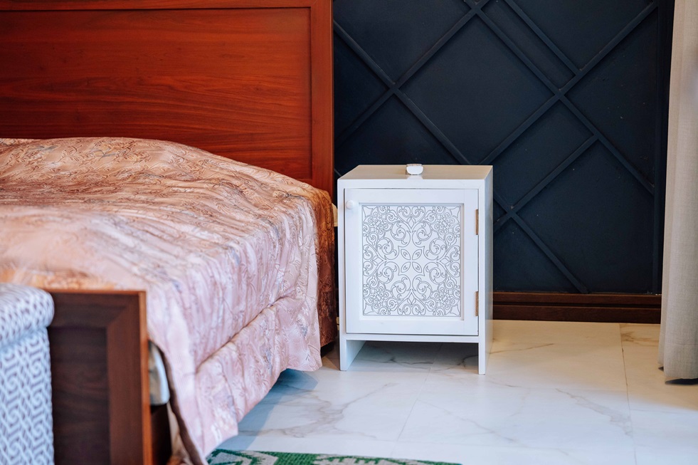 On either side of the bed, our ornate white bedside table brings a soft contrast. The delicate carvings on its door introduce a subtle artistic flair, while the compact design ensures functionality is never compromised. It’s the ideal companion for late-night reads or your favorite candle.